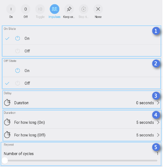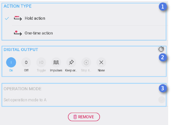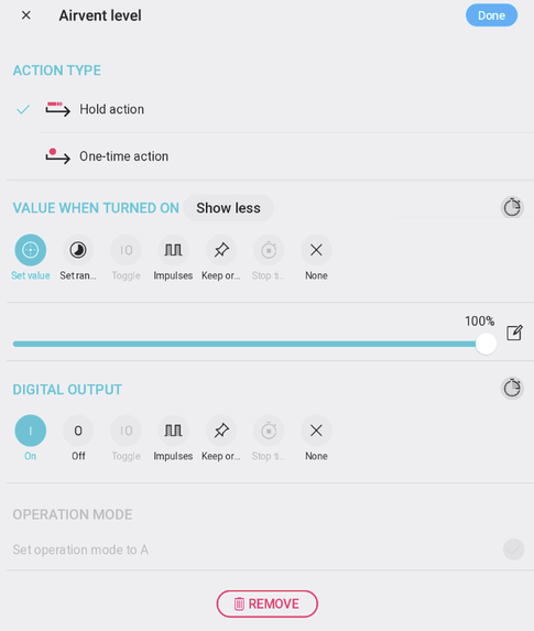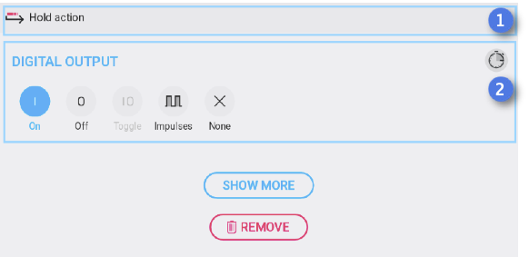 1. Unica azione - l’azione avviene una volta e subito dopo la regola intelligente non controlla più l’uscita interessata. Questo tipo di azione è tipico per i pulsanti che funzionano come un impulso, ma può essere utilizzato anche per altri dispositivi. L’icona per Unica azione non è riempita, è solo contornata dal colore di accento.