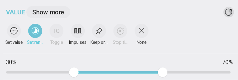 Esempio: luci dell’atrio al piano, al buio, con pulsante e sensore di movimento. Vuoi che il pulsante porti la luce al 100%, ma il sensore di movimento dovrebbe impostarla solo al 20%. Per evitare una situazione in cui l’utente accende prima la luce al 100% con il pulsante, ma poi il sensore di movimento la rileva immediatamente e riporta il valore al 20%, il sensore di movimento dovrebbe usare “Imposta intervallo: 20-100%”. In questo modo, quando il movimento viene rilevato, il valore viene impostato sul valore più vicino all’interno dell’intervallo definito. Se la luce era a 0%, verrà impostata al 20%, ma se era tra 20-100%, manterrà il valore attuale e non verrà riportata al 20%.