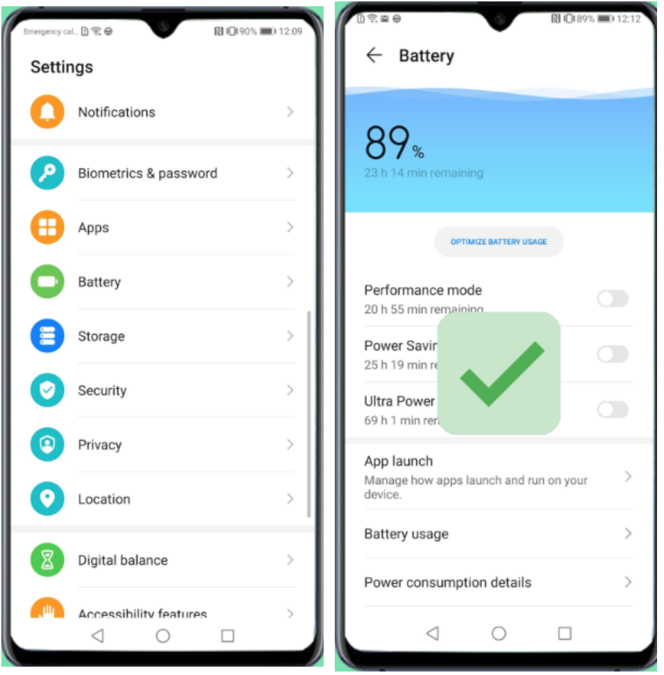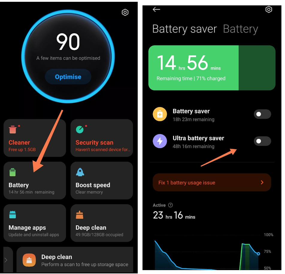 Otvorte sekciu Batéria v aplikácii Bezpečnosť. Vypnite Úsporu batérie a Ultra úsporu batérie.