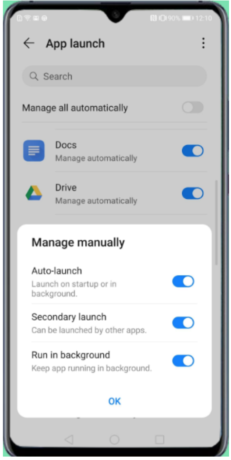 Nájdite aplikáciu TapHome. Vypnite Spravovať automaticky. Aktivujte Spustiť na pozadí.