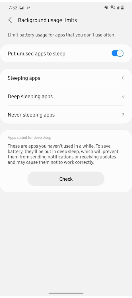 Otvorte Nastavenia. Prejdite do Batéria a starostlivosť o zariadenie → Batéria → Obmedzenia používania na pozadí. Vyberte Nikdy nespiace aplikácie. Klepnite na ( + ). Nájdite aplikáciu TapHome a pridajte ju do zoznamu.